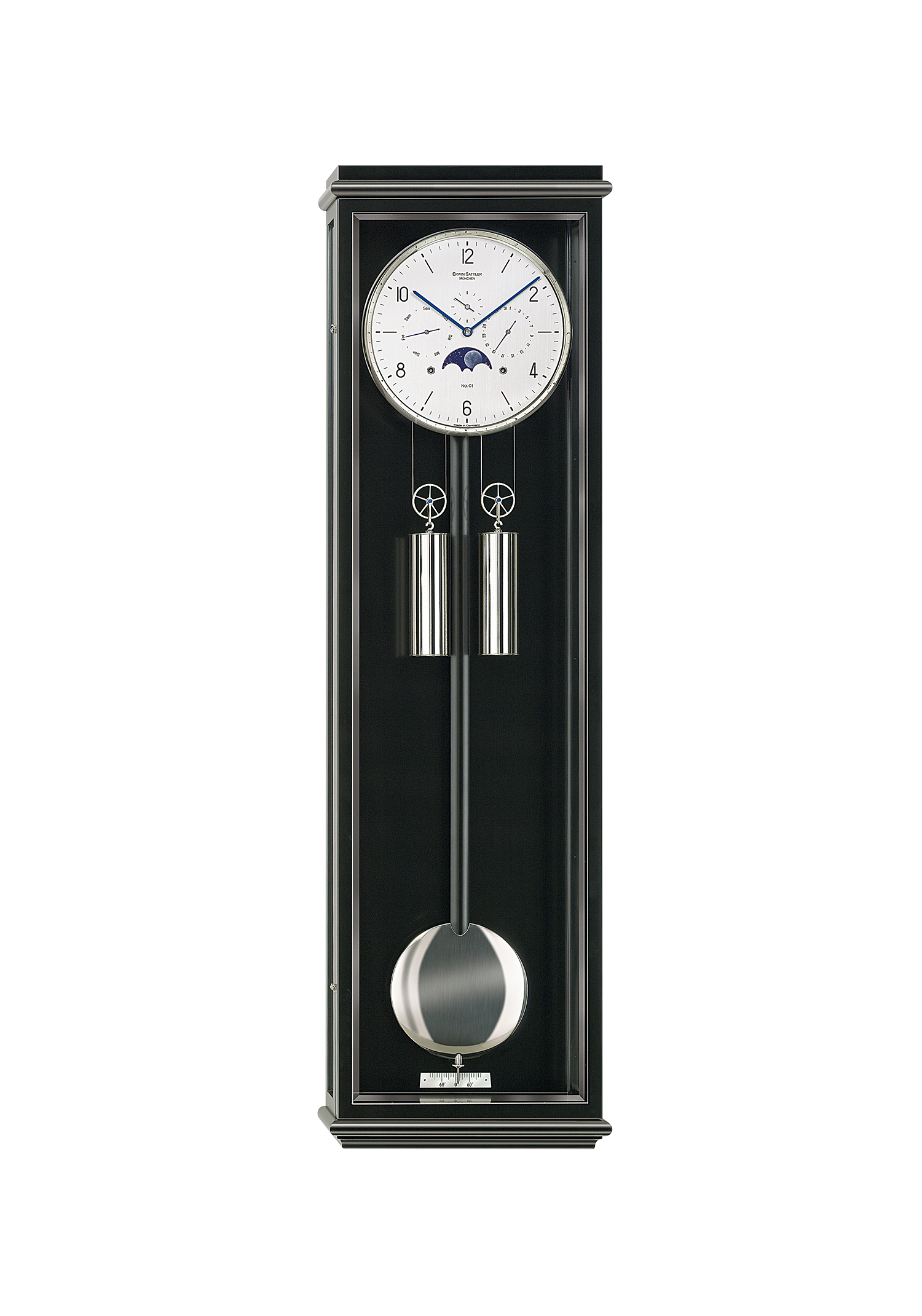 Die Kollektion der Erwin Sattler Manufaktur wird auf Nachfrage von Uhrenliebhabern durch einen Zeitmesser vervollständigt, der zwei Classica Serien miteinander vereint und damit die Entscheidung zwischen Kalenderfunktion mit Mondphasenanzeige und einem erklingenden Schlagwerk hinfällig macht: die Classica KS 100. Sie zeigt Datum und Wochentag mit gebläuten Stahlzeigern an und verkündet die Uhrzeit akustisch mit dezentem Schlag, indem sie zur halben Stunde einmal und stündlich die Anzahl der vollen Stunden auf eine feine Tonfeder schlägt. Die von Hand bemalte Mondscheibe ist von ihrer früheren Position bei der Stundenzahl „12“ an den unteren Zifferblattrand versetzt worden, um den kunstvollen Regulator auch mit einer Sekundenanzeige auszustatten. Liebevoll und in erfahrener Handarbeit gefertigte Bestandteile sind die Lünette und die Pendellinse, die aus massivem Messing gedreht werden. Edle Hölzer umschließen die gewohnt präzise Technik des langlebigen Uhrwerks. Die Classica KS 100 schmückt als vielseitiges Extra sowohl modern kühle als auch traditionell gestaltete Wohnräume. Mit ihren Eigenschaften erfüllt sie sowohl den Wunsch nach einem attraktiven Äußeren, als auch den Traum von funktionaler Vollständigkeit. Classica KS 130 Die etwas größere Classica KS 130 ist zusätzlich zu den Merkmalen der Classica KS 100 mit einem besonders harmonischen Sekundenpendel ausgestattet. Sie ist erhältlich in schwarzem Schleiflack mit facettierten Gläsern und wahlweise römischem oder modern arabischem Zifferblatt.